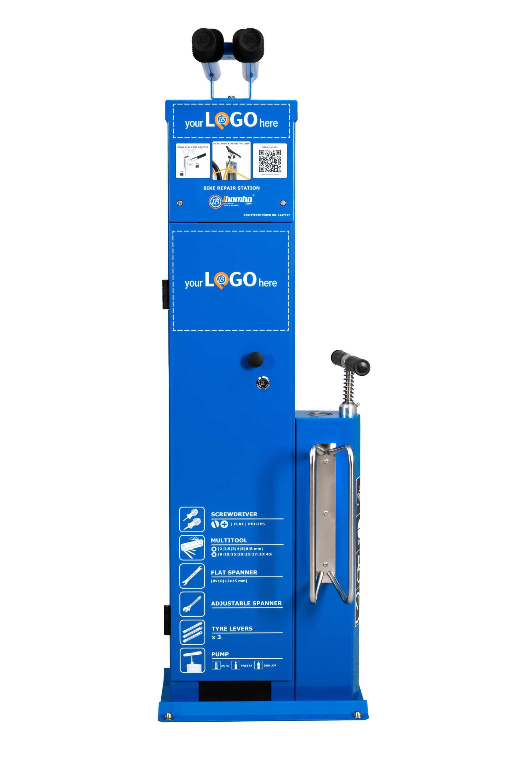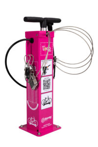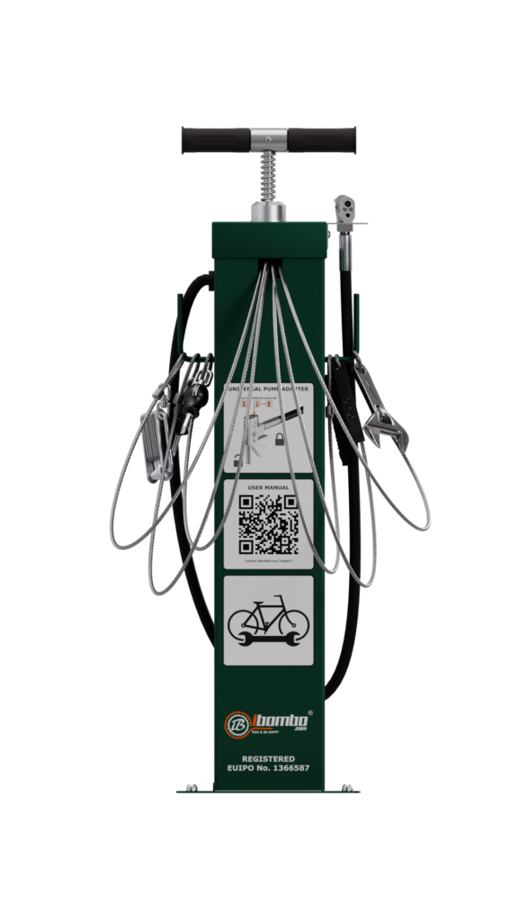 Every IBOMBO bicycle repair station is equipped with professional bicycle tools and a pump with a pressure gauge.