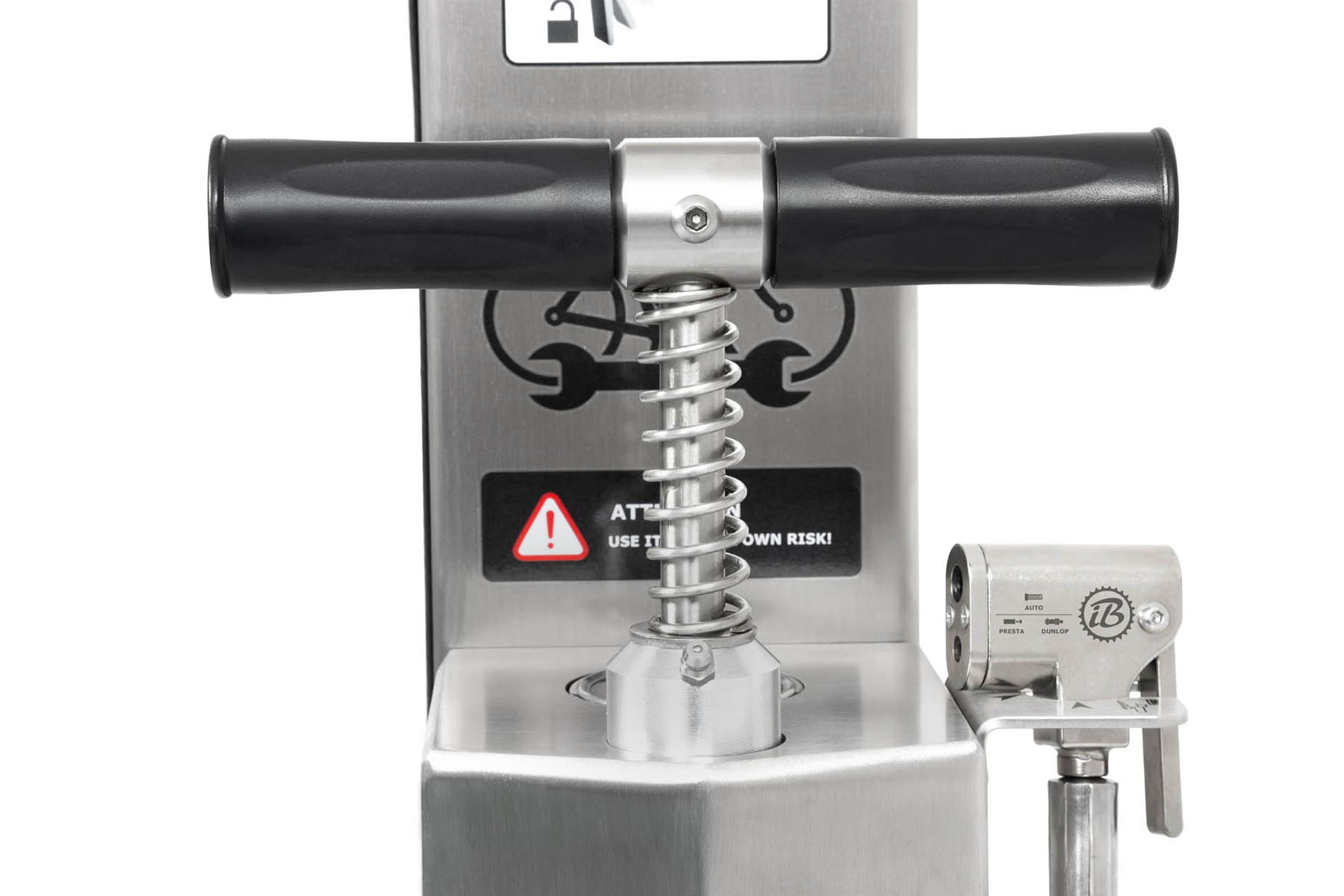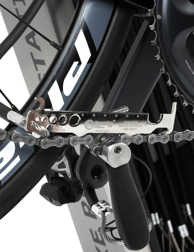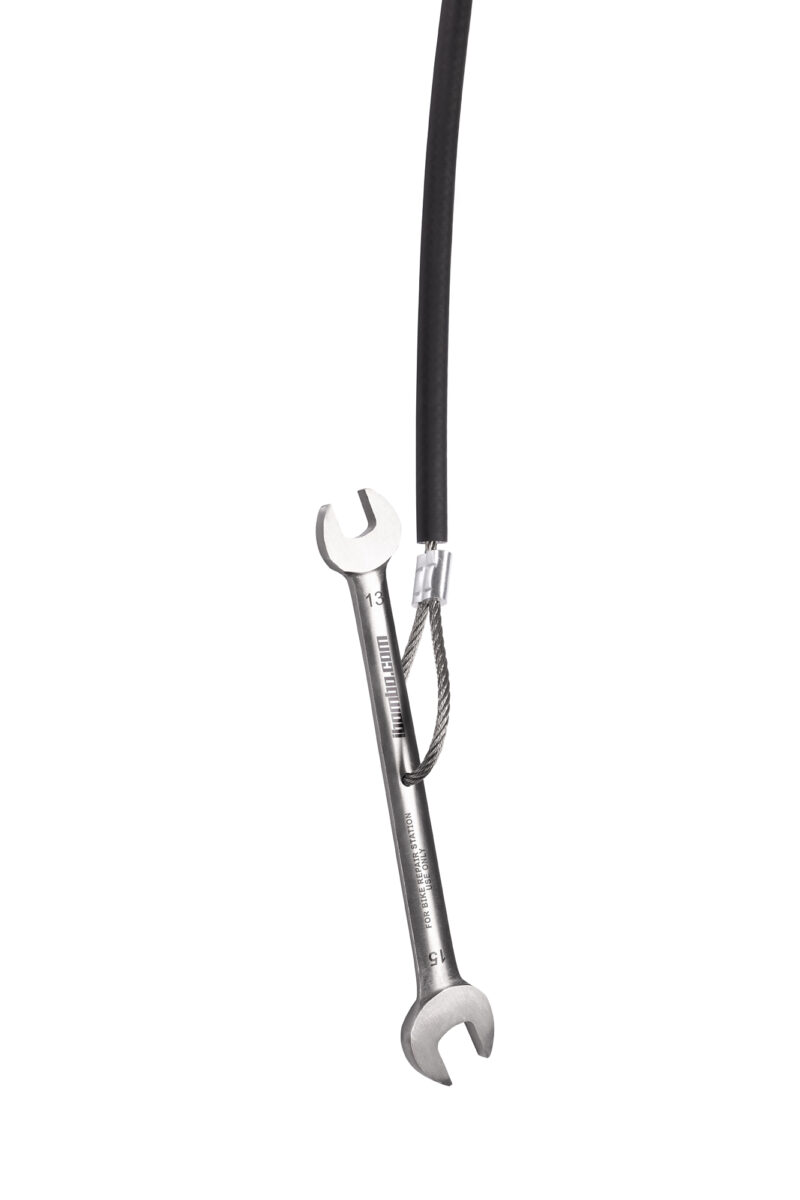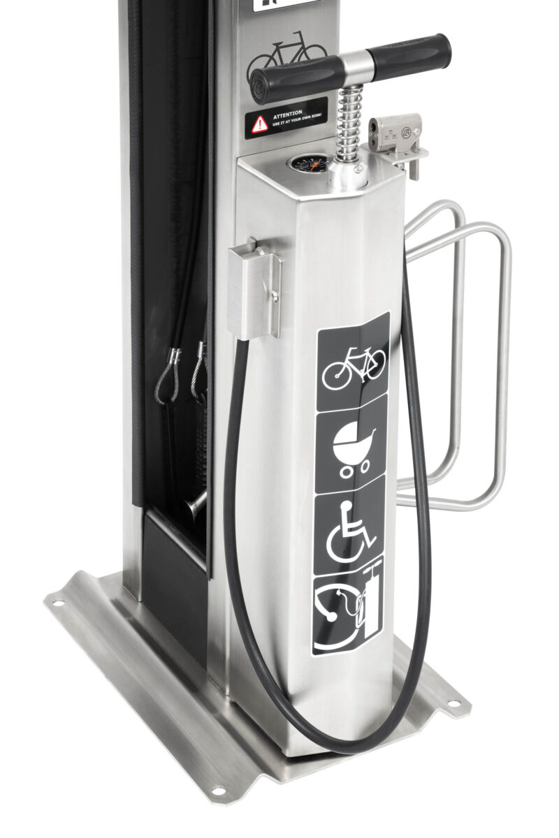 The tools are attached to the stainless steel ropes hanging inside the column of the station; the length of the ropes allows you to reach all bicycle components. The rubber coating of the ropes prevents tools from tangling and protects the bicycle frame from scratching. The station is equipped in a hand pump with an adapter for all valve types. The construction of the station allows you to place the bicycle on the grip, so you can easily turn the crank while repairing the bike.
