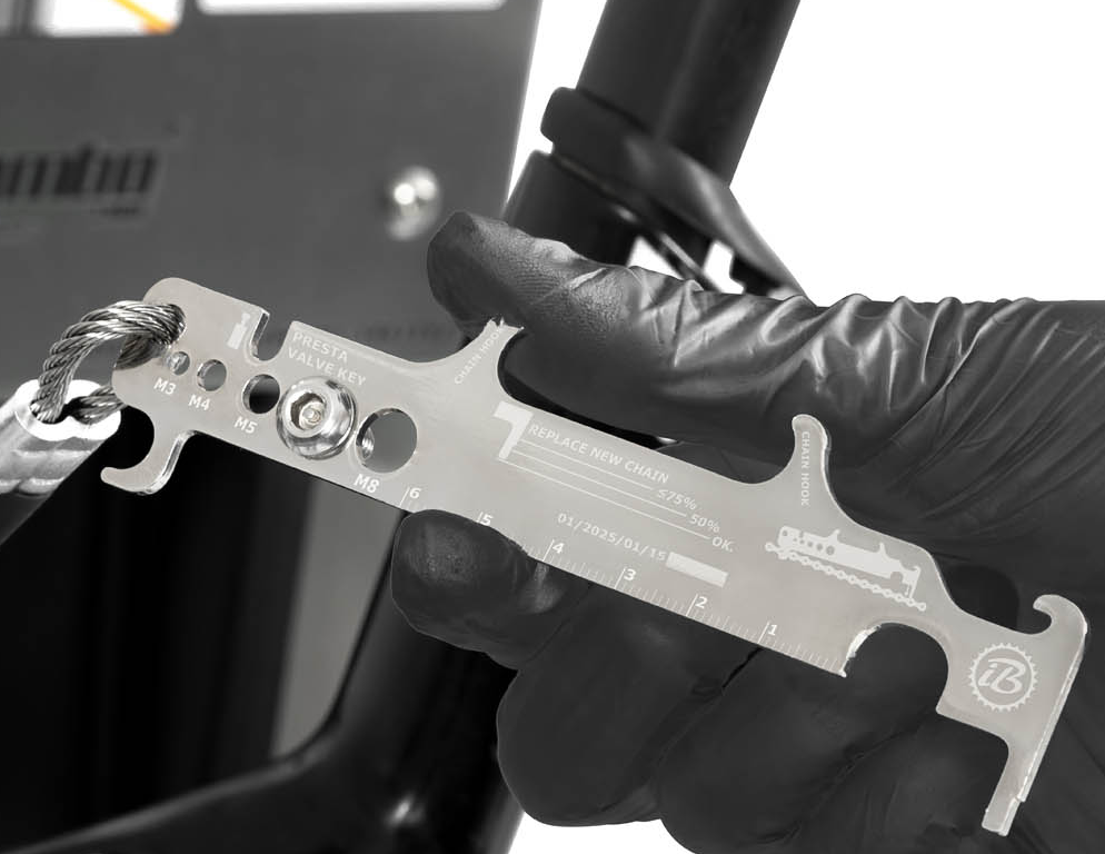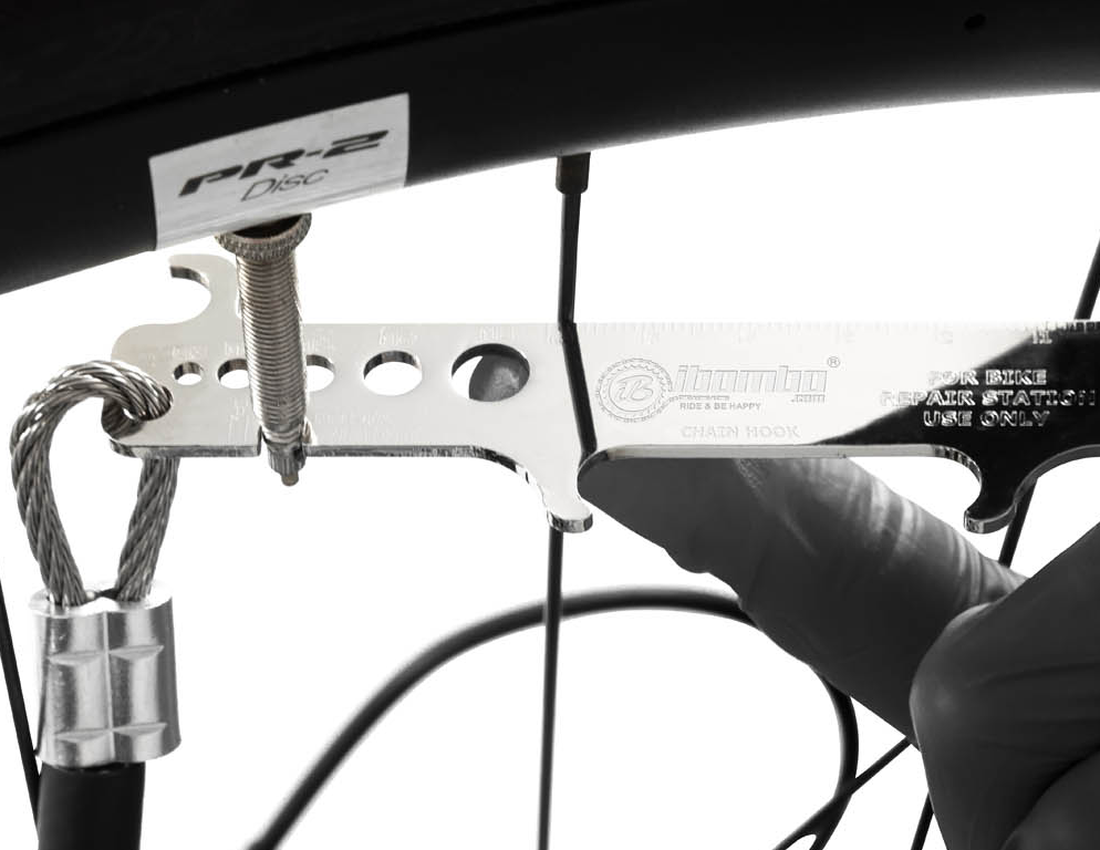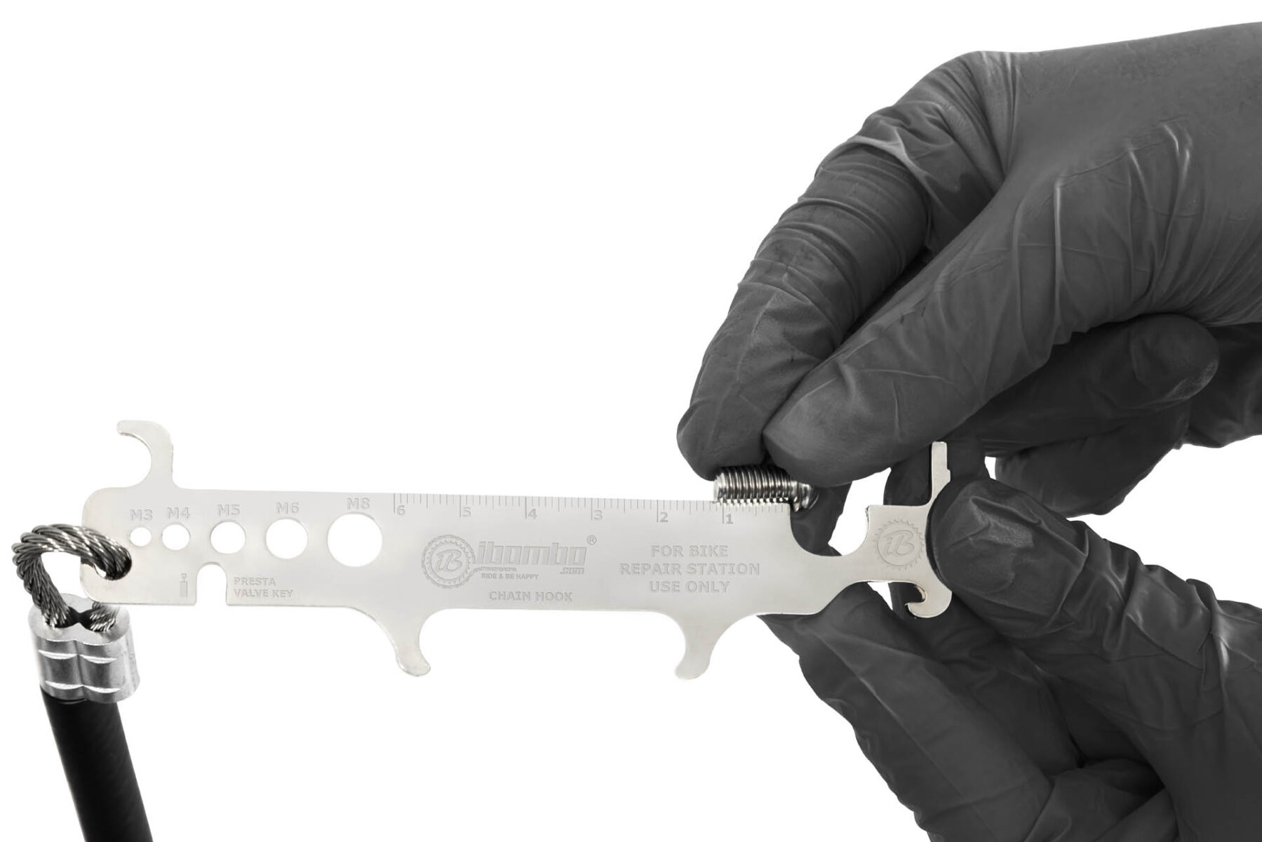 The tools are attached to the stainless steel ropes hanging inside the column of the station; the length of the ropes allows you to reach all bicycle components. The rubber coating of the ropes prevents tools from tangling and protects the bicycle frame from scratching. The station is equipped in a hand pump with an adapter for all valve types. The construction of the station allows you to place the bicycle on the grip, so you can easily turn the crank while repairing the bike.