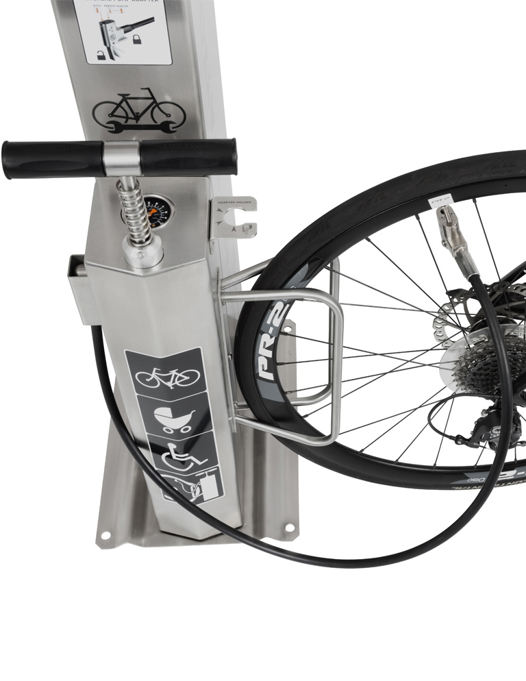 The tools are attached to the stainless steel ropes hanging inside the column of the station; the length of the ropes allows you to reach all bicycle components. The rubber coating of the ropes prevents tools from tangling and protects the bicycle frame from scratching. The station is equipped in a hand pump with an adapter for all valve types. The construction of the station allows you to place the bicycle on the grip, so you can easily turn the crank while repairing the bike.