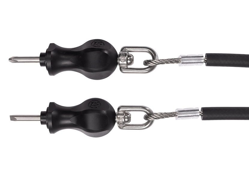 Traditional screwdrivers used in public stations often cause problems for users – their securing cables twist, tangle, or limit freedom of movement, even when a double-sided swivel is used on a round loop. IBOMBO has developed a technology that completely eliminates this issue. The single-sided, integrated swivel allows the screwdriver to rotate fully and smoothly, while the cable remains in a fixed position. As a result, the tool operates lightly and intuitively, making work at the repair station more comfortable and precise.